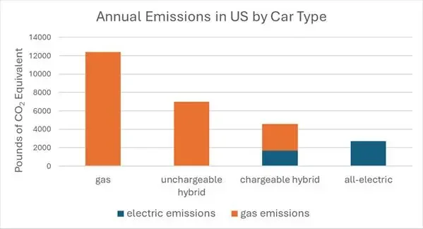 Here are the average per-year life-cycle per-car carbon emissions for the United States by a federal energy data keeper (Alternate Fuels Data Center) using the latest (2022) data and assumptions from the federal Energy Information Administration. In this lifecycle analysis, all tailpipe and car-manufacturing emissions from power plants, chemical releases to the atmosphere, fuel production, fuel burning, etc., that were generated to make and drive the car and its components are totaled and divided by the number of years that the car is expected to remain in use. All gasoline car-attributable emissions are represented in orange columns, whereas electric car-caused emissions (mostly but not entirely from electricity generation) are shown in dark blue. The chargeable hybrid emissions are allocated based on the split of the car’s miles that are driven by the gas engine or the electric motor, respectively.